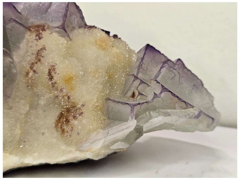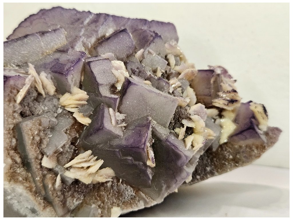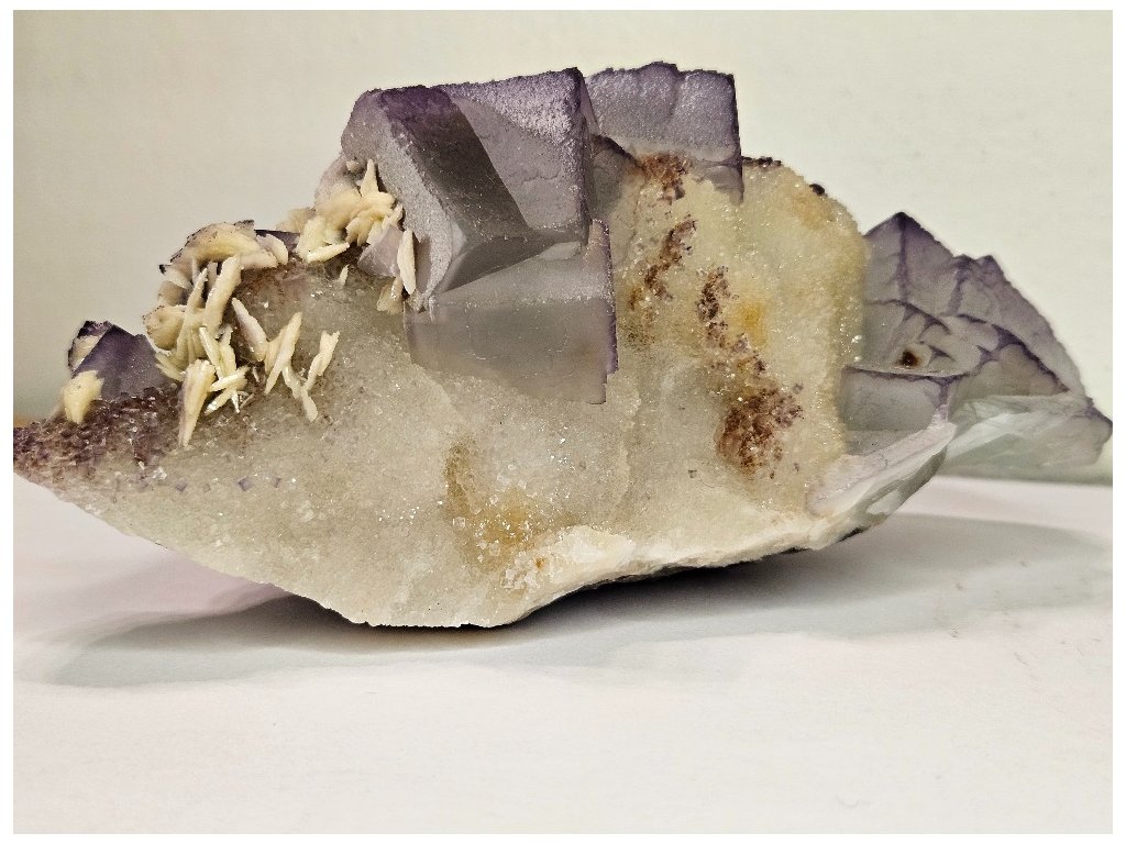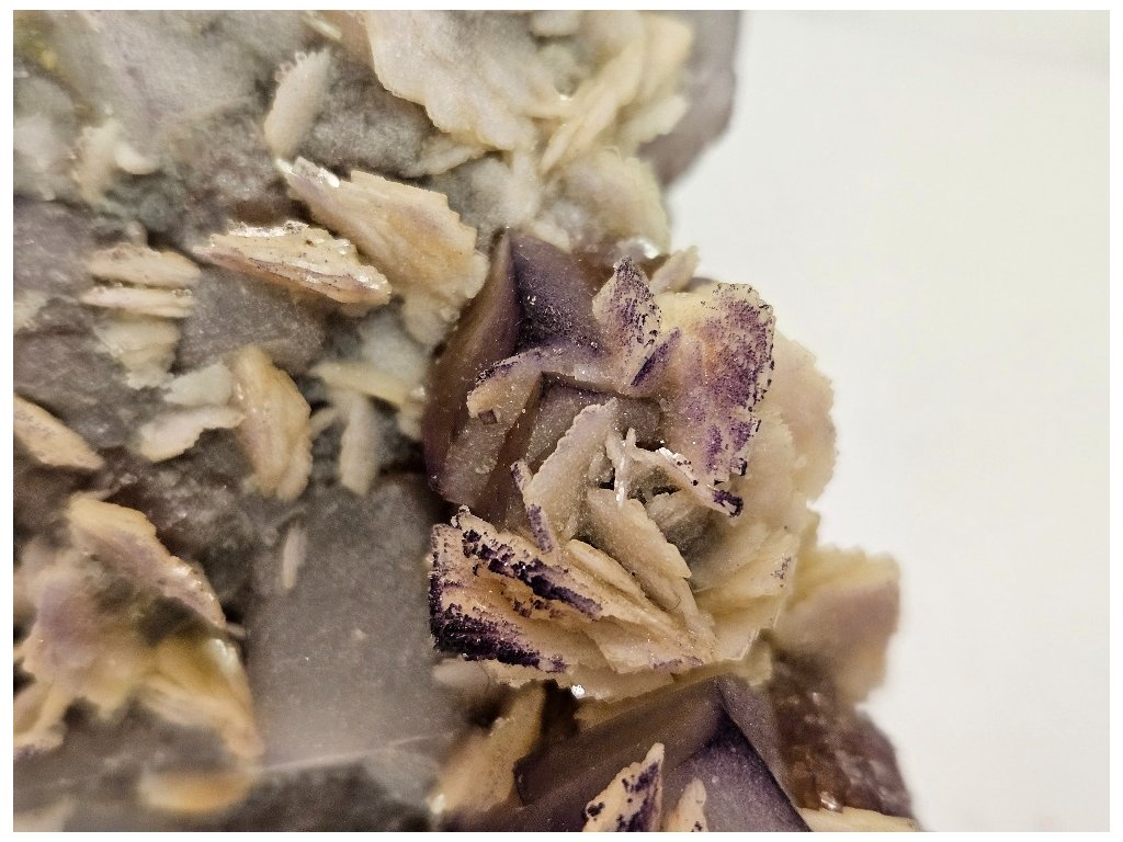 Fluorit je doprovázen výraznými vějířkovitými až rozetovitými agregáty barytu krémově bílé barvy, které vytvářejí silný kontrast k fialovým kostkám fluoritu. Na některých barytových lupenech jsou patrné drobné fialové povlaky a inkluze fluoritu, což zvyšuje vizuální atraktivitu vzorku. Matice je tvořena jemnozrnným křemenem.
