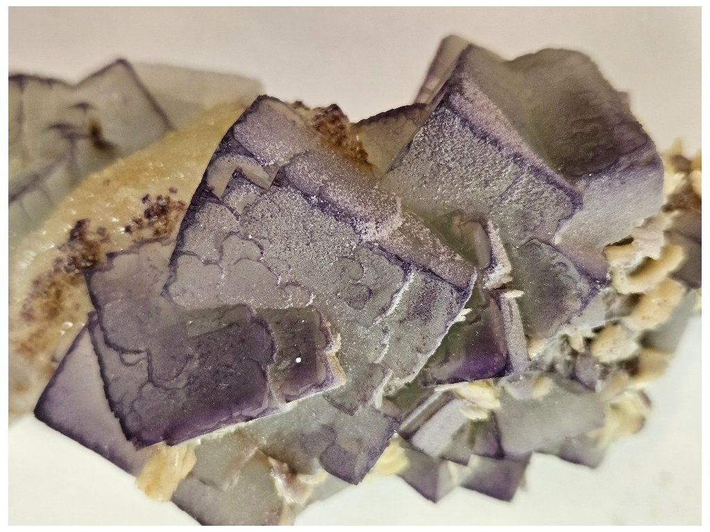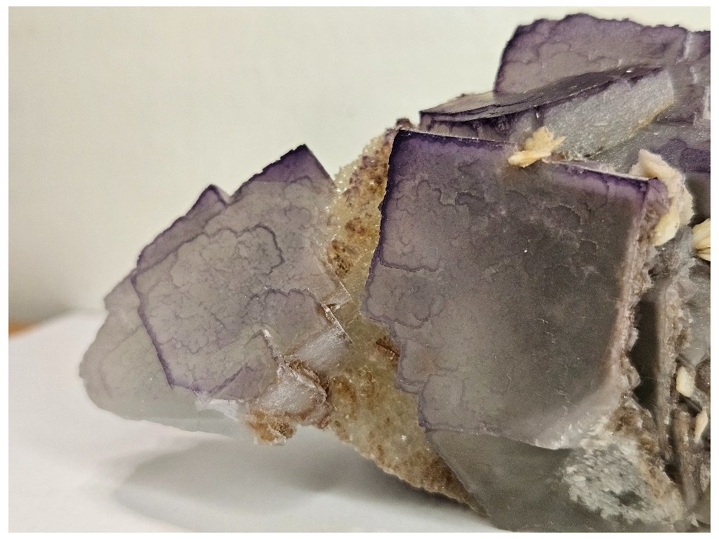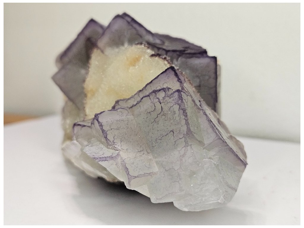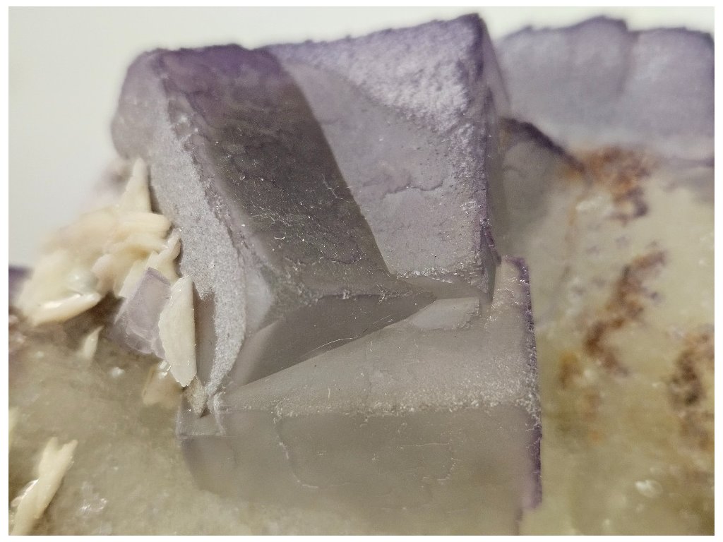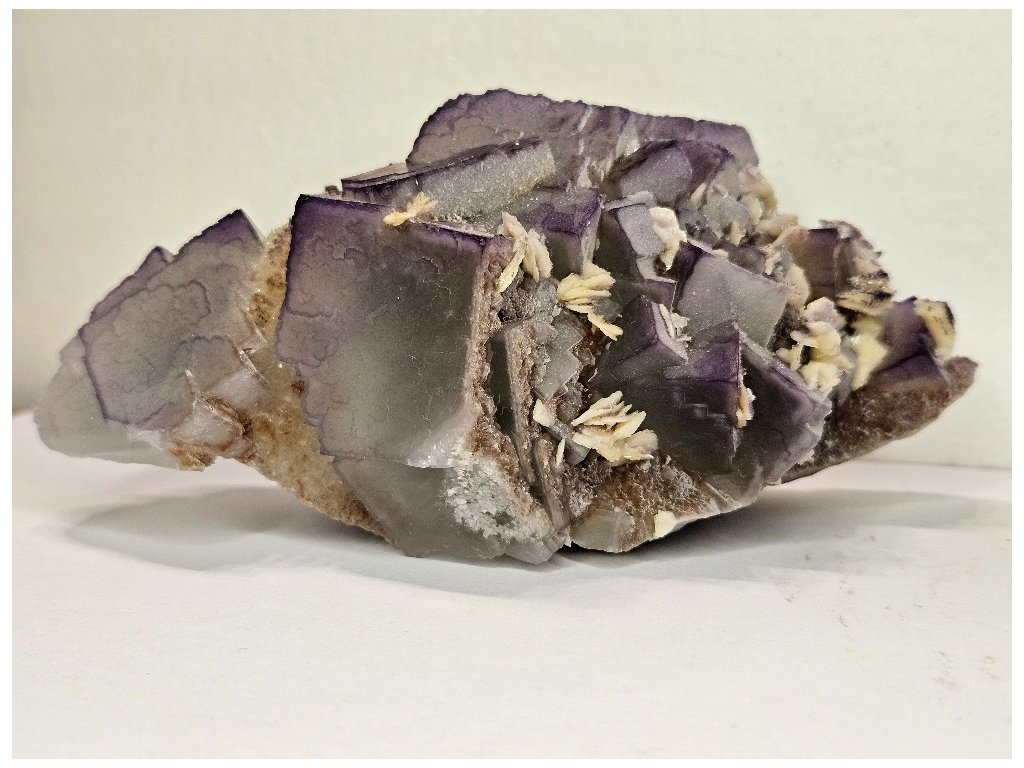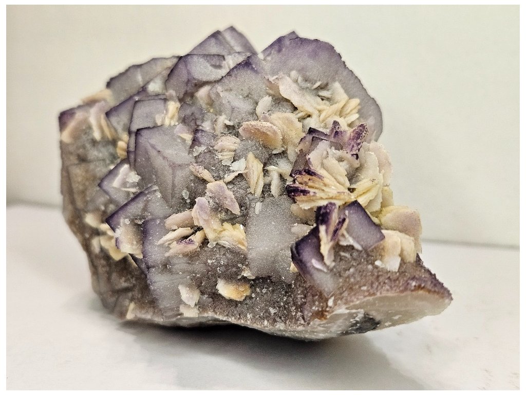 Estetický sběratelský vzorek fluoritu v typické paragenezi s barytem z proslulé lokality Yaogangxian. Fluorit tvoří dobře vyvinuté kubické krystaly šedo-fialové až levandulové barvy, místy s jemným barevným zónováním – světlejší jádra a tmavší, fialově zvýrazněné hrany. Krystaly jsou převážně poloprůsvitné, s jemně „mléčným“ vzhledem charakteristickým pro tuto oblast.