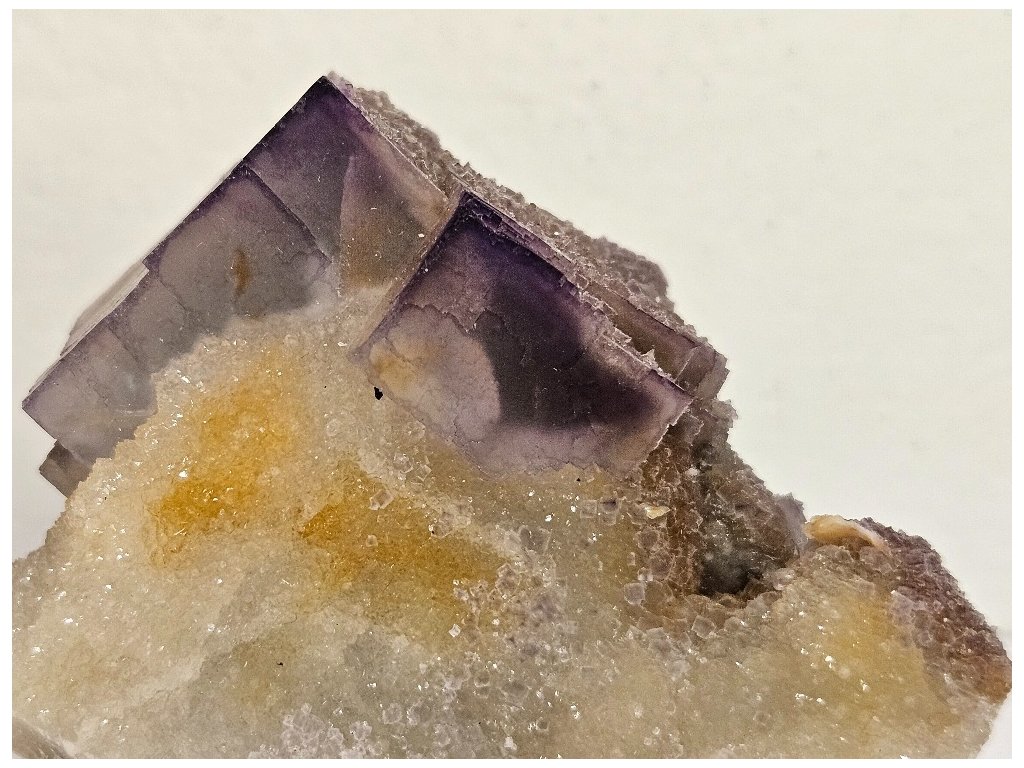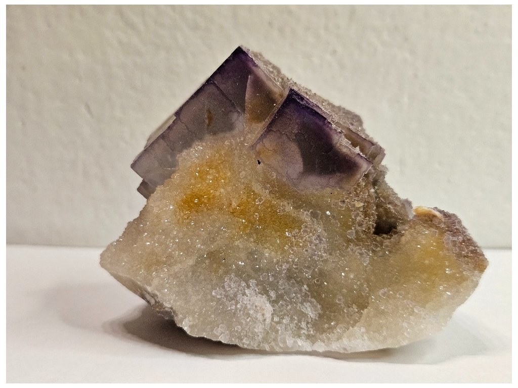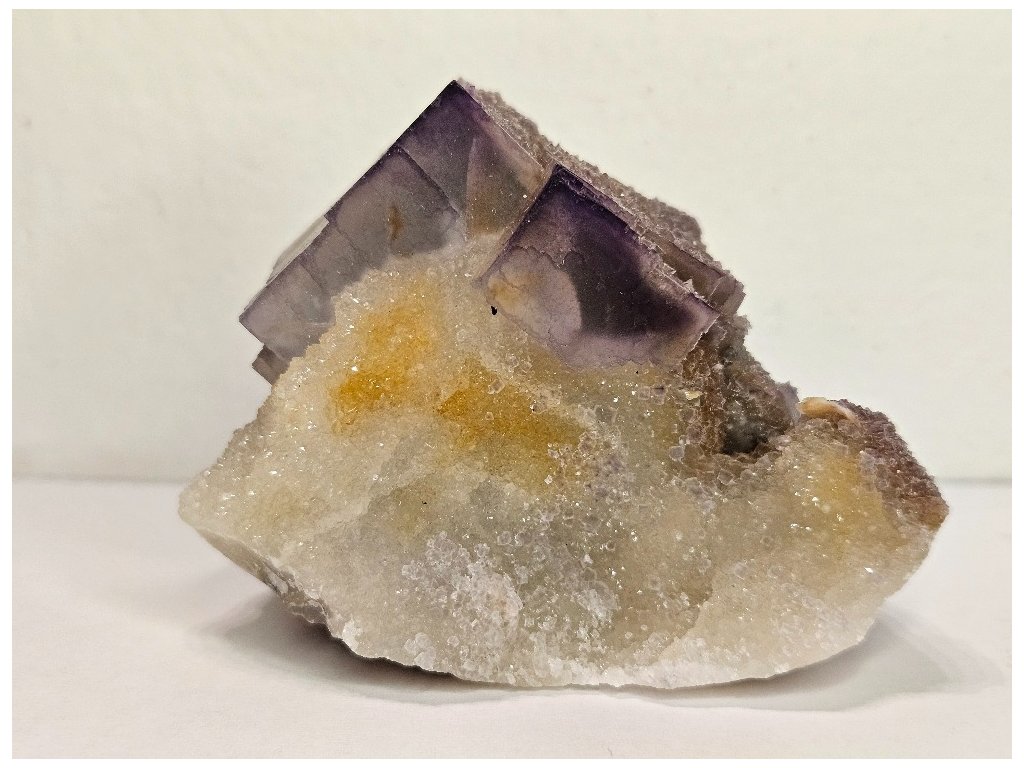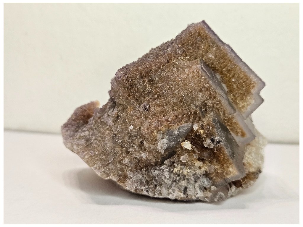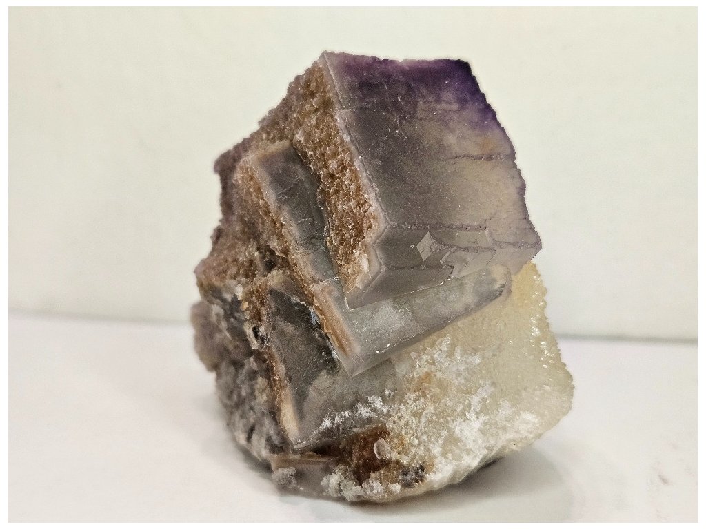 Estetický sběratelský vzorek fluoritu z proslulé lokality Yaogangxian. Fluorit tvoří dobře vyvinuté kubické krystaly šedo-fialové až levandulové barvy, místy s jemným barevným zónováním – světlejší jádra a tmavší, fialově zvýrazněné hrany. Krystaly jsou převážně poloprůsvitné, s jemně „mléčným“ vzhledem charakteristickým pro tuto oblast.