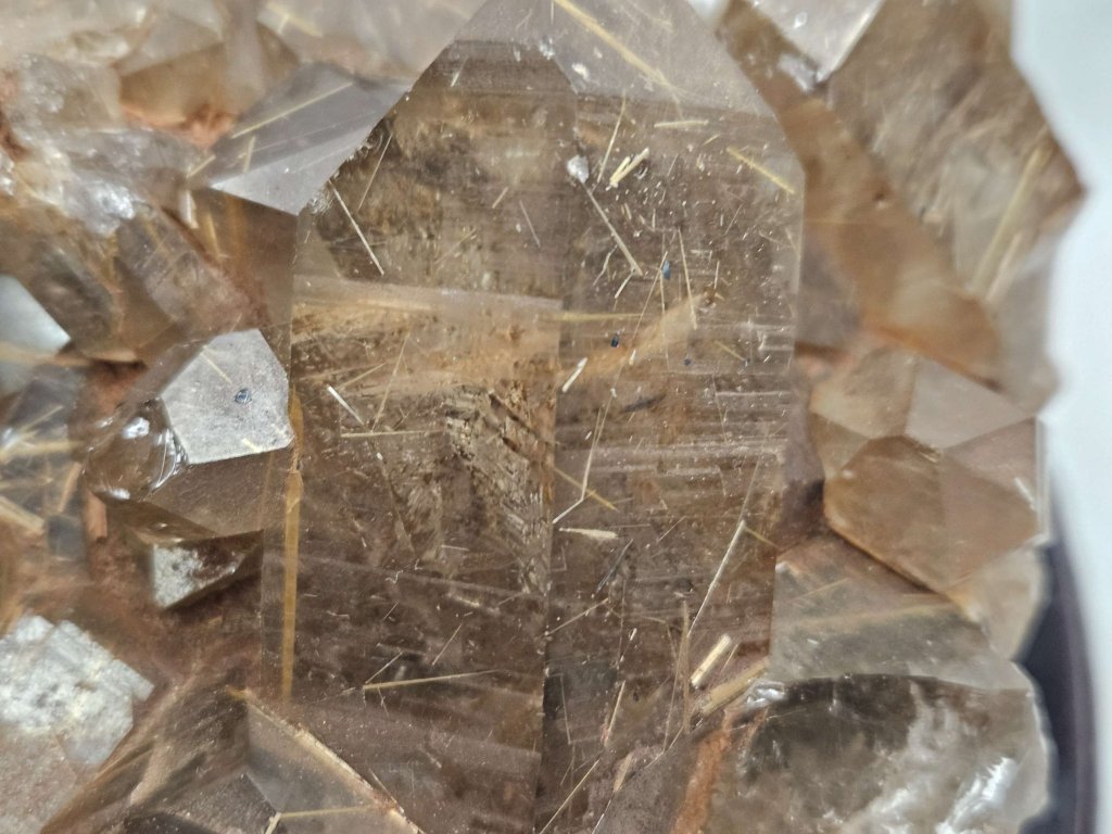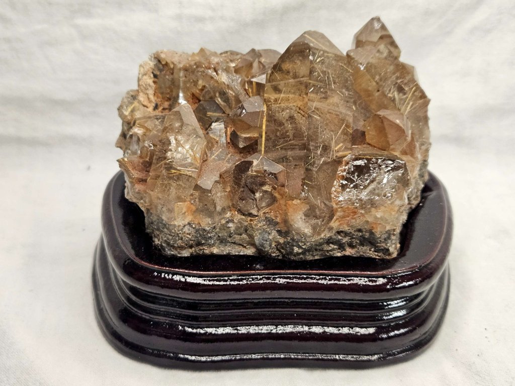 Nádherný kus sagenitu na dřevěném stojánku, přírodní křišťál s vrostlicemi zlatého rutilu. Tento minerál je známý pro své jedinečné zlatavé a stříbřité jehličkovité inkluze, které vytvářejí efektní obrazce. Skvělý doplněk pro sběratele minerálů, milovníky přírody i ty, kdo hledají harmonii a krásu v interiéru.